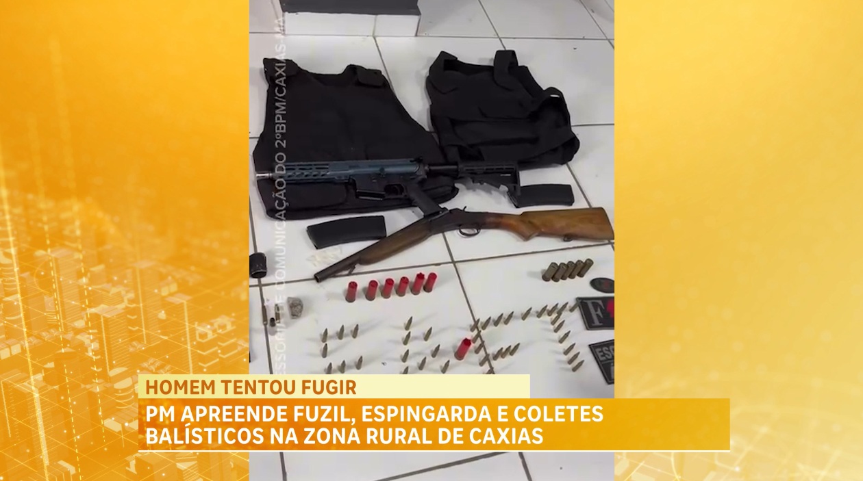 Ao chegar ao local, as equipes avistaram um suspeito armado com uma espingarda calibre 12. Ao perceber a presença policial ele tentou fugir por uma área de mata, mas foi alcançado e capturado pelos militares. Durante as buscas nas proximidades, os policiais localizaram uma mala contendo um fuzil calibre 5.56 municiado, além de carregadores, coletes balísticos, munições de diversos calibres, aparelhos celulares e outros materiais de origem ilícita.