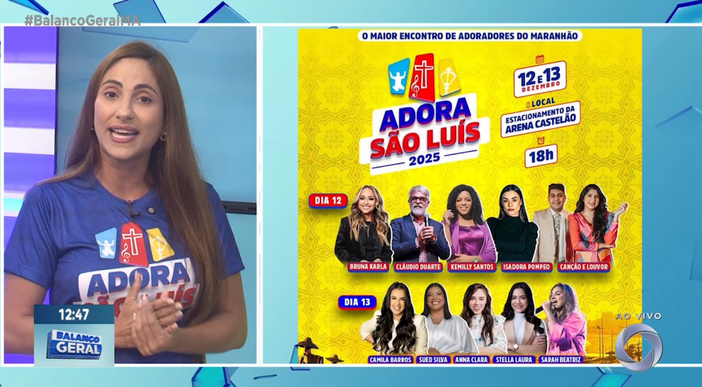 Em entrevista ao Balanço Geral, Carol Carvalho apresentou detalhes do evento Adora São Luís, iniciativa que busca conectar fiéis por meio da música e da espiritualidade. Ela convidou o público para participar do evento gospel que será realizado nesta sexta-feira (12) e no sábado (13). A programação desta sexta começa às 18h.