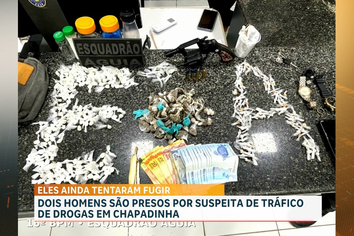 Ao chegarem ao local, os policiais flagraram os suspeitos fracionando e embalando drogas. Após tentativa de fuga pelo matagal e cerco policial, a dupla foi detida em posse de uma arma de fogo com quatro munições intactas, além de 168 invólucros de cocaína, 98 de crack, 68 de maconha e 15 de haxixe.