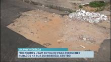 Moradores preenchem buracos com entulhos na Rua do Ribeirão, em São Luís